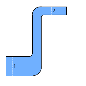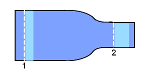Let us take the closed pipe that we can see above. Closed means that no mass can enter or leave the pipe between surface 1 and surface 2. Since no mass can enter or leave the pipe we have conservation of mass. So the amount of water that flows through surface 1 per second must equal the amount of water that flows through surface 2.