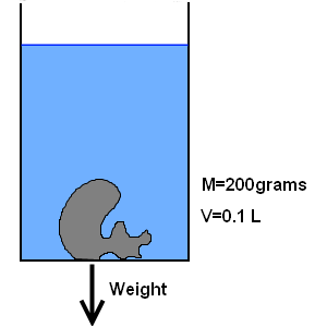 If we have a container full of water (\(\rho= 1000 \frac{kg}{m^3}\)) and a submerged object with a mass of 200 grams, which takes up 0.1 litres of volume, how much does the object weigh?