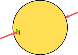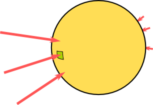 The figure above shows a small patch of area on the surface of the ball lets call it \(A_p\). Now we know the pressure is \(10\) pa, the force must be \(10\times A_p\) and its direction is normal to the surface. This means the force points straight towards the center of the ball.