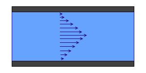 Imagine that the fluid is made up of an infinite number of layers of fluid, each of which moves with their own velocity.Each of these layers of fluid experiences a kind of friction with the layers above and below it. For normal friction we have the friction coefficient \(\mu\). For fluids we have viscosity \(\eta\). Viscosity exists because of the interaction between the fluid molecules.
