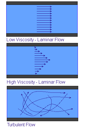 Fluids have the property that at a solid/liquid boundary the fluid velocity has to be zero. For low viscosity fluids the fluid reaches it’s maximum velocity at a small distance from the boundary. A high viscosity fluid requires a larger distance from the boundary to increase velocity.